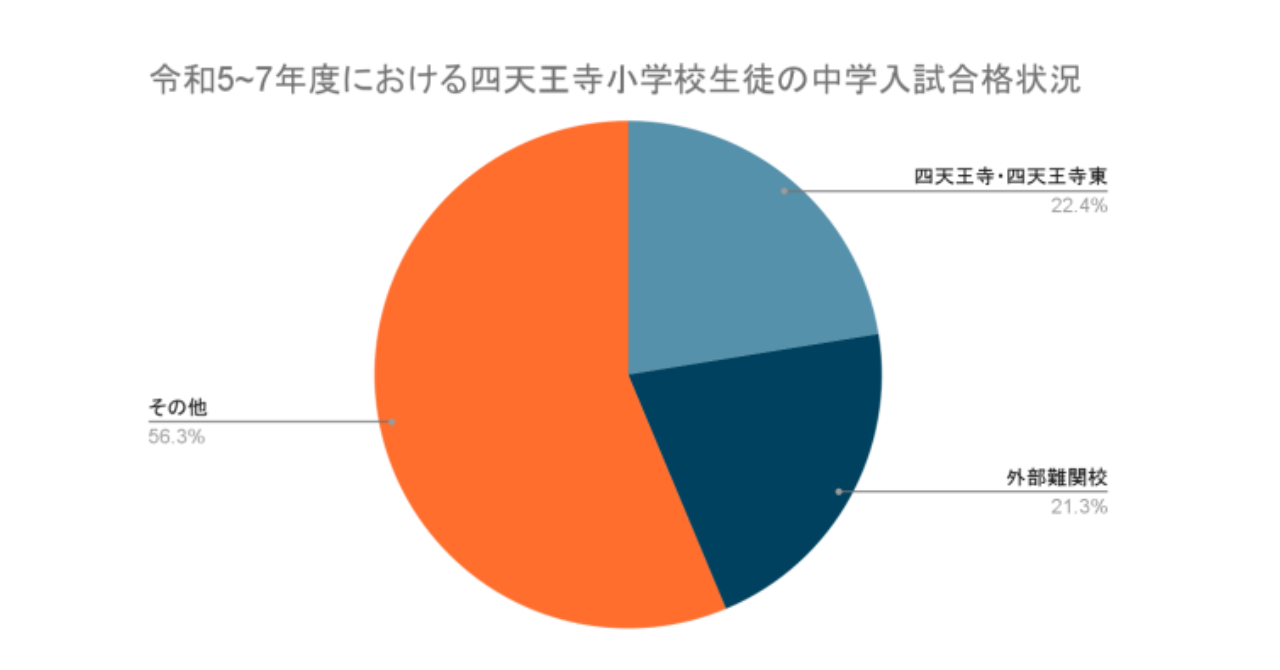 近年の進学状況を見ると、内部進学(四天王寺中学校・四天王寺東中学校)に進む児童が全体の一部を占める一方で、外部の難関中学校を受験する児童も安定して存在しており、進路選択は一様ではありません。